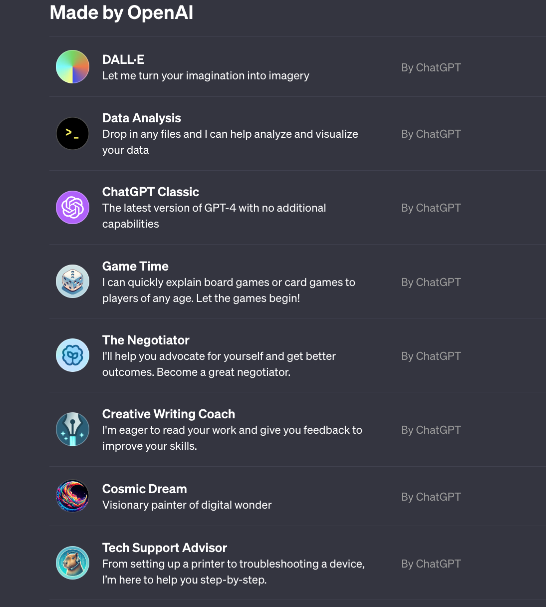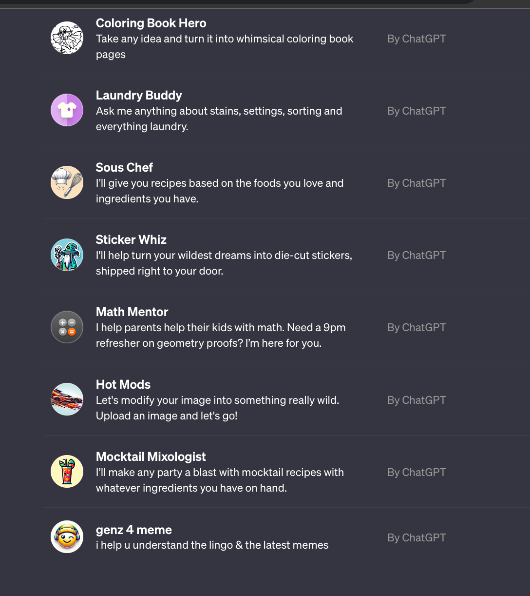 Meanwhile, OpenAI is already making available a number of custom GPTs its built. See screenshots of some of the earliest official ones below. A number of third-party users have also built and begun sharing theirs, too.