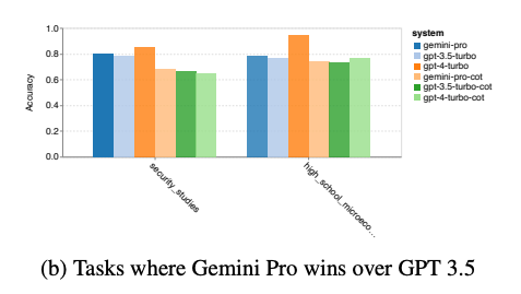In that test, “Gemini Pro achieves an accuracy lower than that of GPT 3.5 Turbo, and much lower than that of GPT 4 Turbo,” specifically a score of 64.12/60.63 (out of 100/100) compared to GPT-3.5 Turbo’s 67.75/70.07, and GPT-4 Turbo’s 80.48/78.95. See the top row of the following table included in their paper.