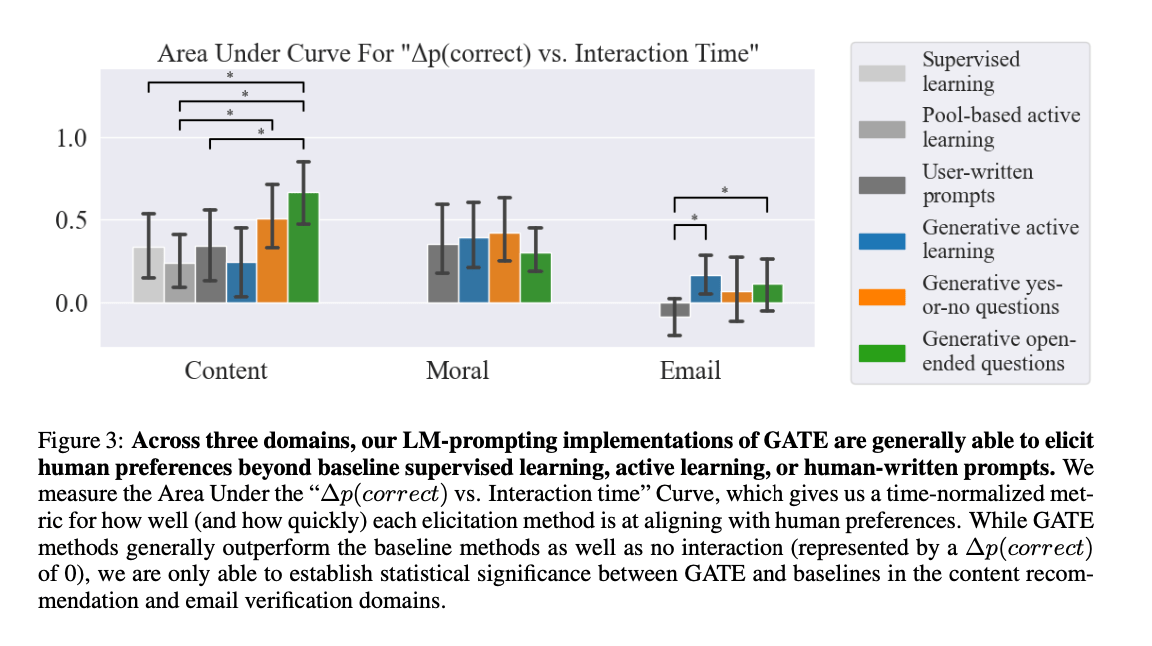 Ultimately, the researchers state that they “presented initial evidence that LMs can successfully implement GATE to elicit human preferences (sometimes) more accurately and with less effort than supervised learning, active learning, or prompting-based approaches.”