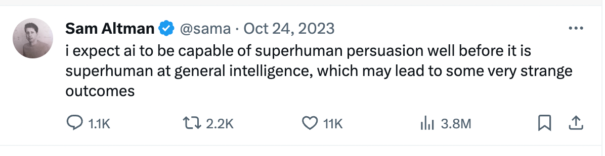 Altman also posted cryptic messages about the potential of AGI as recently as October 2023, when he wrote “I expect AI to be capable of superhuman persuasion well before it is superhuman at general intelligence, which may lead to some very strange outcomes.”