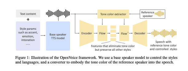 By using a “base speaker,” for the TTS model, and then combining it with the tone derived from a user’s provided recorded audio, the two models together can reproduce the user’s voice, as well as change their “tone color,” or the emotional expression of the text being spoken. Here’s a diagram included in the OpenVoice team’s paper illustrating how these two models work together: