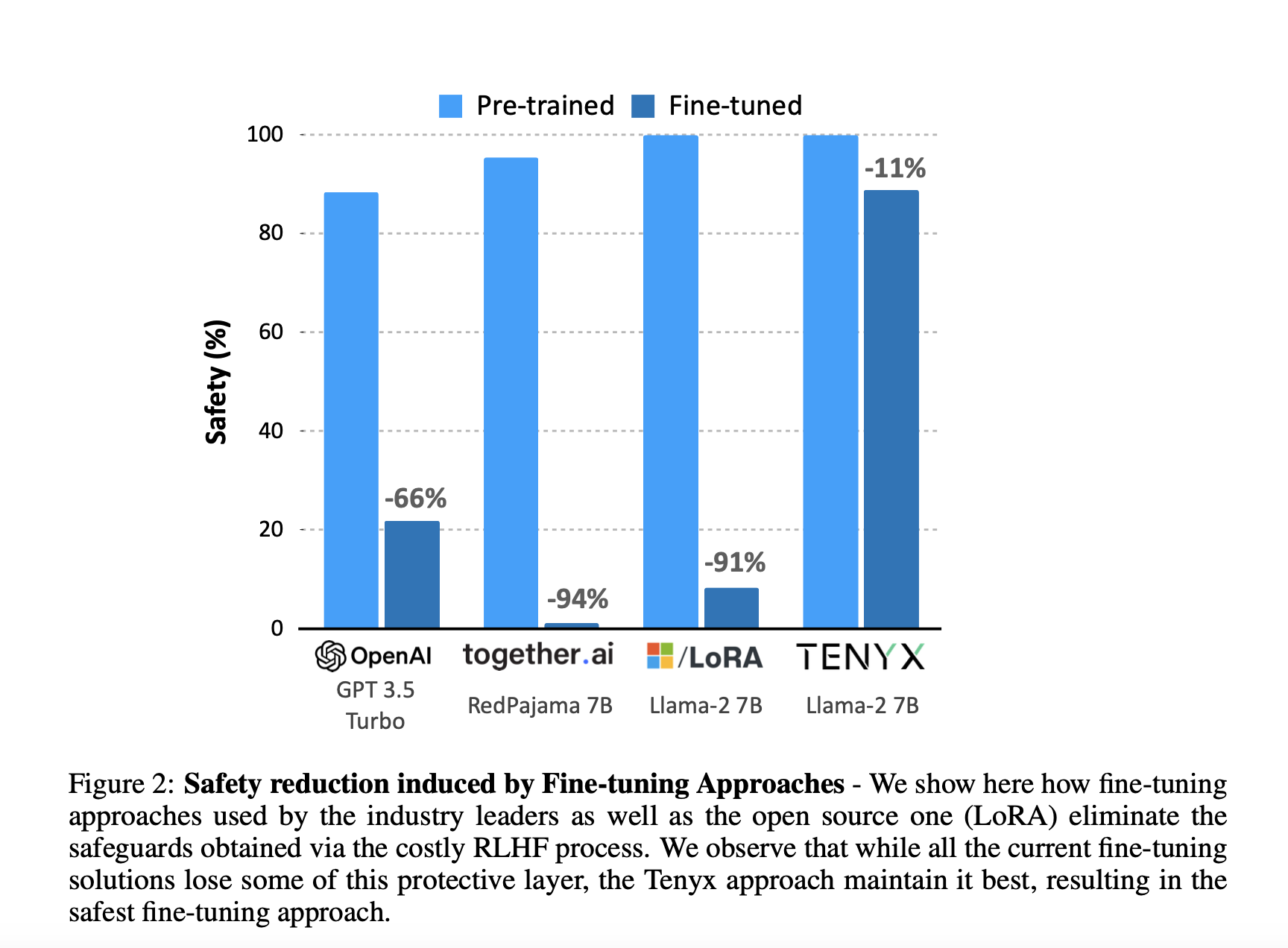 - Safety: Tenyx fine-tuning saw an 11% reduction compared to OpenAI’s -66%, Together AI’s -94%, and LoRA’s -91%.