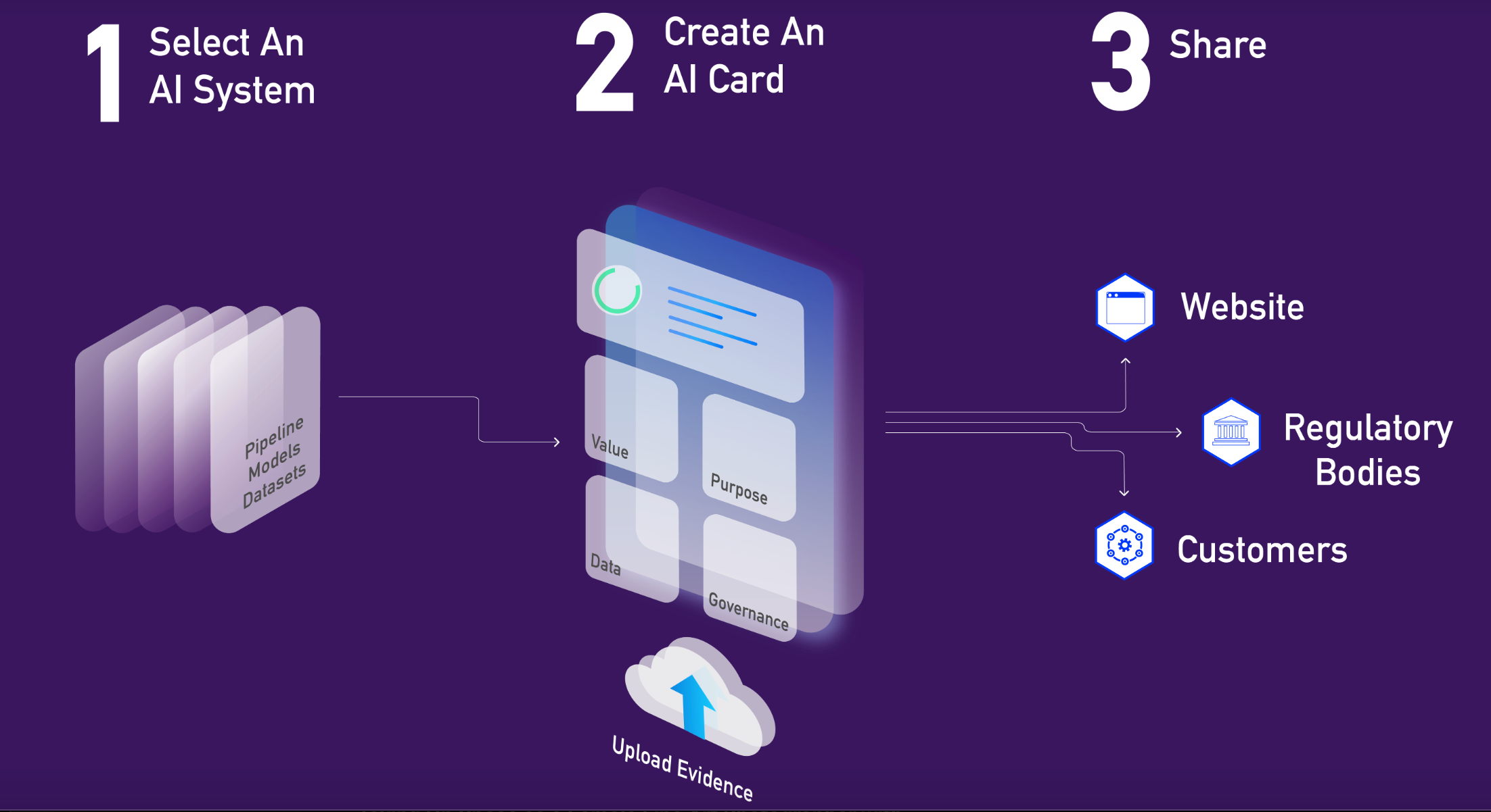 Companies can upload evidence that supports each of these areas. Then, they can share the AI Card out with third-parties as requested, including on their own websites, with government agencies, or even with customers and new clients.